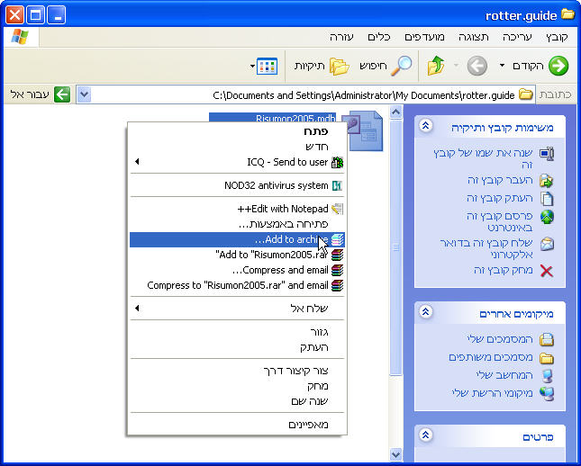 אחריי זה , לחצן ימיני על הקובץ ואז על Add to archive...