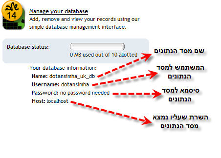 13. כעת נלמד כיצד מגלים את השם משתמש, שם המסד והסיסמא אליו.