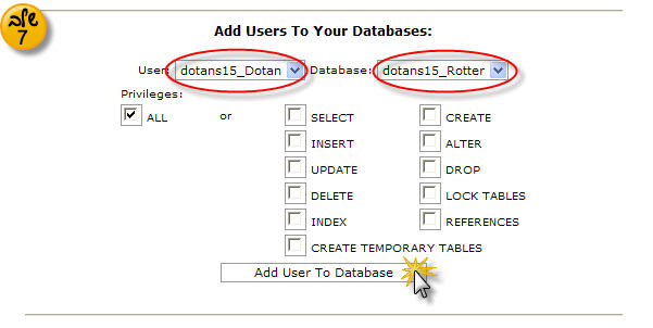 לכן נבחר את המשתמש ואת מסד הנתונים ונסמן את האפשרות "ALL", ונלחץ על "Add User To Database":