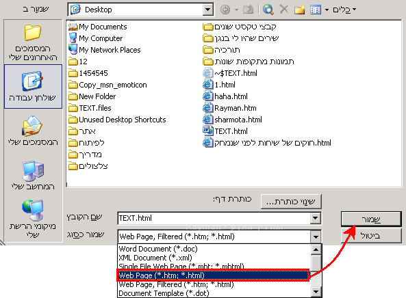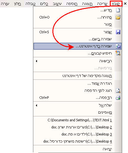 הדבר הבא זה לשמור את הקובץ שיצרנו, אז אנו נשמור את העמוד כדף אינטרנט HMTL: