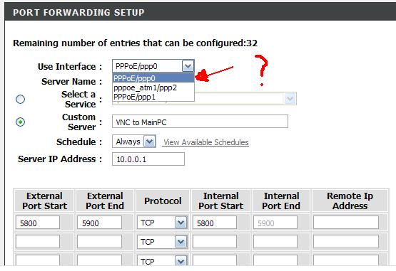 אתמול יכלתי להתחבר בVNC למחשב שלי והראוטר הצליח לעשות פורט פורוורדינג למחשב שלי! מאז כיביתי את הראוטר והפעלתי מחדש, (IP לא מהווה בעייה כי יש לי DYN DNS) ועדיין לא הצלחתי להתחבר מבחוץ! אחרי שחזרתי הביתה שיחקתי עם ההגדרות בממשק ה-Port Forwarding וגיליתי שאם אני שם על PPPoE/ppp0 אז זה עובד, אם אני מפעיל מחדש את הראוטר, אז זה כבר לא עובד! ושוב IP לא משחק תפקיד כי יש לי DYN DNS, ואז שיחקתי עם זה עוד קצת, הפעם הגדרתי את הכל אותו דבר רק שיניתי מ-PPPoE/ppp0 ל-PPPoE/ppp1 !