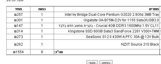 (TMS, אבל בלי קשר לחנות מסויימת) כמה שאלות: 1. אני נוטה לכיוון ליבה גרפית משולבת במעבד בסגנון עדות הG2020. הוא יעמוד במשימות, או שעדיף כרטיס בסיסי חיצוני? 2. אם כן, יש לAMD משהו עדיף? לא אכפת לי להוסיף כמה שקלים. 3. בחרתי לוח עם צ'יפסט B75 שהבנתי שהוא נותן תמורה טובה למחיר בתקציב. יש משהו עדיף מהלוח הנ"ל? (חשוב לי USB3, SATA3, 7.1 וHDMI) 4. מארז זול, MIDI, שקט לא צריך להיות יפה. יש המלצות? 5. כנ"ל ספק לכל האוסף, חשוב שיהיה מבית טוב, מאוורר 120 מ"מ, ושקט, באיזור ה250₪. 6. ראיתי המלצה לSSD M4. גם גרסת ה64GB טובה? עריכה: אני מוסיף את הדברים לפי הסדר לבקשת מפרט: תקציב: 1500 גמיש. שימושים: אינטרנט, סרטים FHD, משחקי פלאש, סטרימינג, לא צריך להריץ משחקים. ללא אוברקלוק. ללא ציוד הקפי חומרה דורשה: מפורט למעלה, לא צריך הרכבה חנות מועדפת: בצפון הארץ, לא באינטרנט, ולא שתי הרשתות שלא טוב לקנות בהן מחשב.--- --- --- --- ---