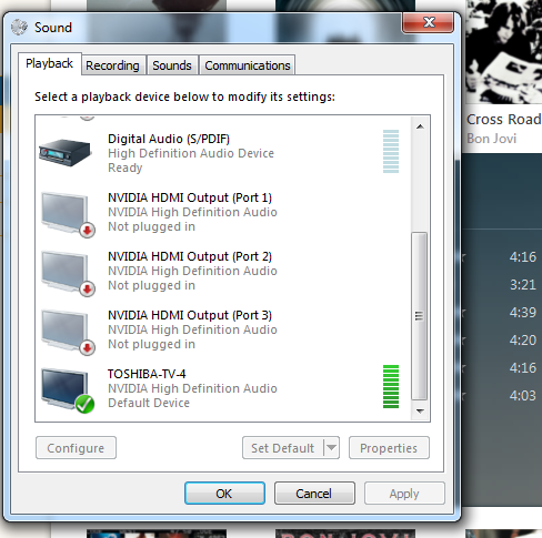 ובנוסף בהגדרות של Playback devices הגדרתי את הטלוויזיה כברירת מחדל ואפשר לראות שיש אות כאשר אני מפעיל שיר כלשהו, אך בפועל לא באמת יוצא סאונד מהטלוויזיה: