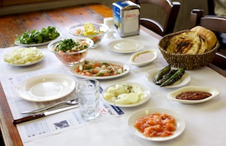 סלט ירקות ערבי קצוץ דק, פלפל חריף (ידוע כביסבס בפי תושבי המקום), פיתות מהבילות מהתנור, חומוס ביתי, וכמובן העגבניות והבצל בגריל ששמם יצא למרחקים.