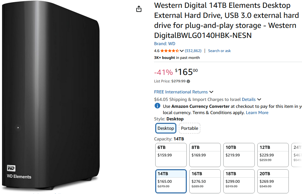 קפץ לי לעין, אולי יעניין פה מישהו: כרגע באמזון - כ-40% על כונן חיצוני 14TB של WD