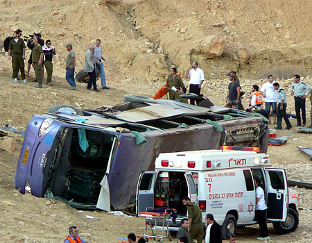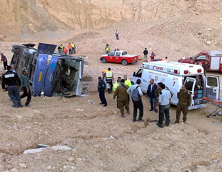 אוטובוס שהסיע תיירים מרוסיה התהפך לתהום כשלושה קילומטרים צפונית לאילת. בית החולים יוספטל, שאליו פונו 33 פצועים, בהם 23 במצב קשה: "איננו יכולים להתמודד עם כמות כזו של נפגעים". עד ראייה: "נהג האוטובוס השני שעצר שם - אמר שהאוטובוס שנפגע עקף אותו ומיד עף לתהום".http://www.ynet.co.il/PicServer2/28102008/1748151/16122008524_wh.jpg