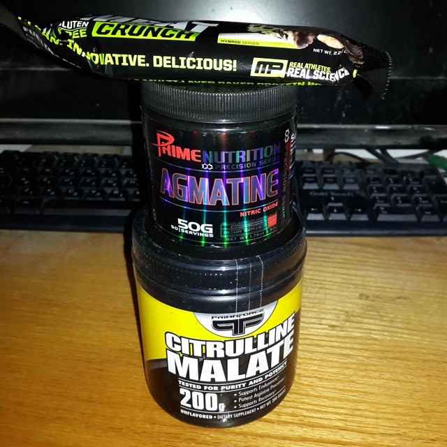 קניתי Agmatine Sulfate ו Citrulline Malate שהם מן הסתם כחלק מהpwo יחד עם הקפאין שיש לי מAllmax, ועל הדרך קניתי חטיף חלבון חדש שמנסה להתחרות בQUEST של MP, מבחינה קלורית 210, 20 חלבון, 28 פחמימות (12 מתוכן סיבים), 7 שומן. הדבר היחידי שמפריע לי לקנות כזה חטיף בעתיד מעבר לטעם שעוד לא ניסיתי, זה 459 נתרן לחטיף אחד, אפילו QUEST לא עובד את ה320.