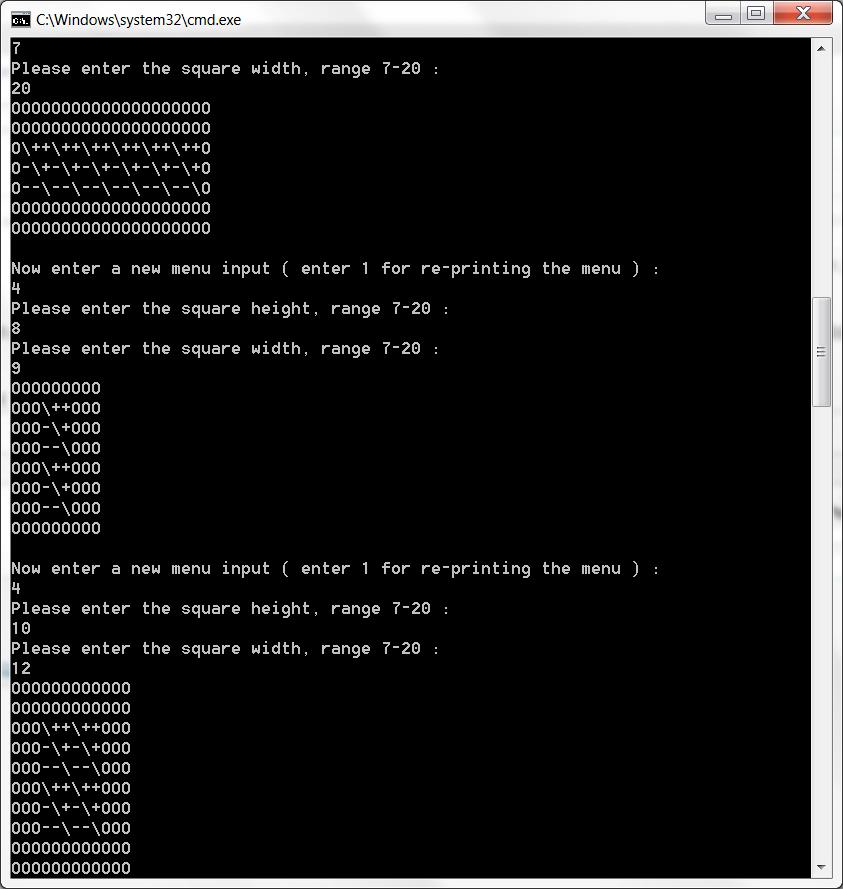 באופציה זו בתפריט תבקש התכנית 2 מספרים שטווחם ינוע בין 7 ל 20 ( כולל קצות הטווח ), המספרים יהוו אורך ורוחב של מלבן שיודפס על המסך. בהינתן 2 המספרים הללו תיצור התכנית מלבן עם 2 שכבות. השכבה החיצונית תהיה מורכבת מהאות O ( o גדולה ), והשכבה האמצעית תהיה מורכת מריבועים בגודל 3*3 שנתייחס אליהם כאל מטריצה. האלכסון הראשי של המטריצה יורכב מהתו '\' , החלק מעל לאלכסון במטריצה יורכב מ התו '+' והחלק התחתון יורכב מהתו '-' . החוקיות להדפסה היא : על 2 השכבות למלא את כל המלבן, לשכבה החיצונית יהיה לפחות עובי של 1 גם לגובה וגם לאורך, על המלבן להכיל מקסימום ריבועים פנימיים ועל השכבה החיצונית להיות סימטרית לצירים x ו - y כאשר מספר המטריצות בכל מימד יכול להיות זוגי או איזוגי בהתאם לדרישות ( בסוף המלבן תופיע שורת רווח ).