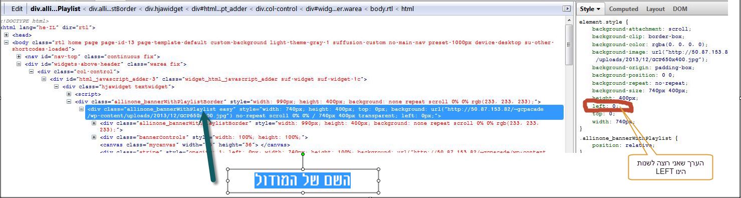 שלום, אני מנסה לעדכן סליידר/פלאגין שרכשנו לאתר - WP , (במקור הפלאגין מיועד ל- LTR אבל WP מותקן בעברית.) ולכן הוא לא יושב במקום. כאשר אנינעזר ב- FIREBUG לברר היכן המיקום הדרוש שינוי, מופיע הערכים מתקבלים מה- elment.style אני יודע שאין מדובר ב- CSS . השאלה איפה אני מוצא היכן לשנות כדי שהסליידר יישב במקום. כך נראה האתר כרגע: http://50.87.153.82/~gcpacade/ הערך שאני רוצה לשנות - זה LEFT . כדי להזיז את הסליידר שמאלה השם של המודול: allinone_bannerWithPlaylist easy ראו צילום מסך: