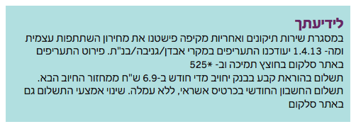 לאבא שלי יש קו אחד בסלקום, הוא בקושי מדבר ובקושי עושה משהו עם המכשיר כי יש לו מכשיר מהעבודה - אז בתוכנית שהם נותנים לו זה שווה לו. היום קיבל חשבונית ושם יש הערה ממוסגרת שמהחשבונית הבאה, תשלום באמצעות הו"ק יגבה בעמלה של 6.9, למשלמים בכרטיס אשראי לא תהיה עמלה.