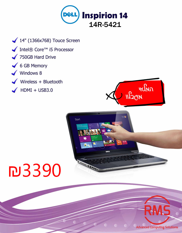 מבצע על מחשב נייד מבית DELL מסך מגע ''14 מעבד i5, זיכרון 6GB ודיסק קשיח 750GB