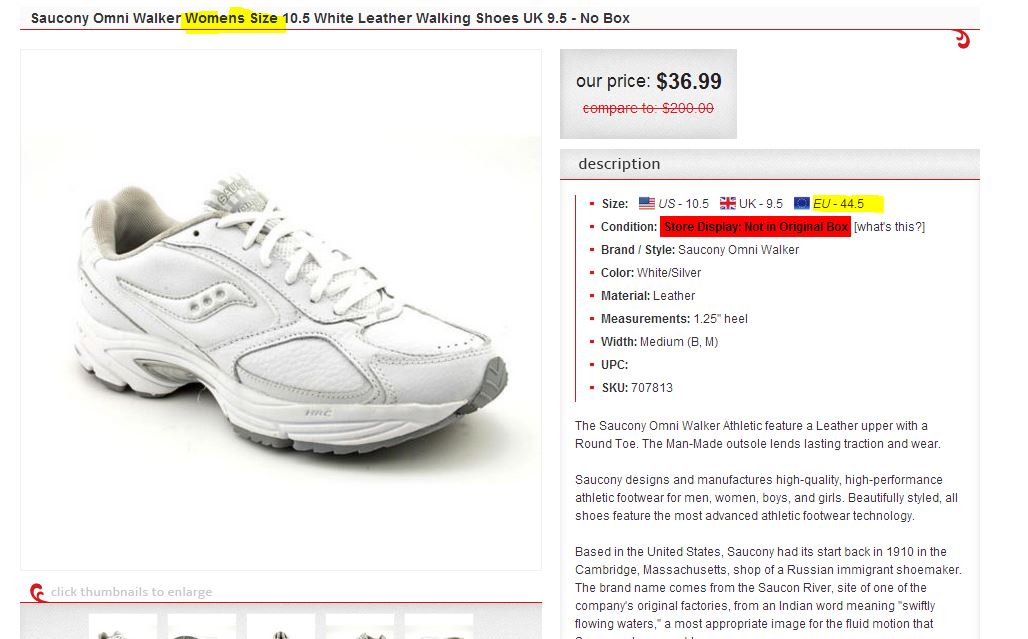 בתאור נמוצר המוכר כתב רק מידה אמריקאית ואנגלית וציין שהנעל היא במידת נשים ולא גברים