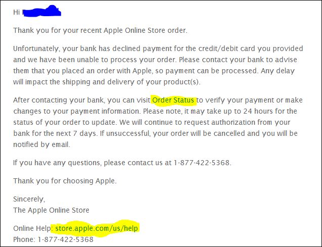 רכשתי דרך האתר אייפון,כמו שקראתם בשיחות (או לא) הבנק המטומטם עשה איזה טעות וחסם את הרכישה ועכשיו אפל הקפיאו לי את הקנייה,קיבלתי מייל מהם שהם ינסו לאשר את הרכישה במשך שבוע ואם לא יצליחו הרכישה תתבטל,היום סידרתי את הענינים עם הבנק ונכנסתי דרך המייל שקיבלתי מהם לסטטוס רכישה ואני מקבל את הדף הבא: