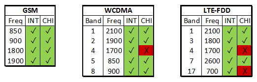 ההבדלים בתדרים הנתמכים בין הגירסה הסינית לבינלאומית -