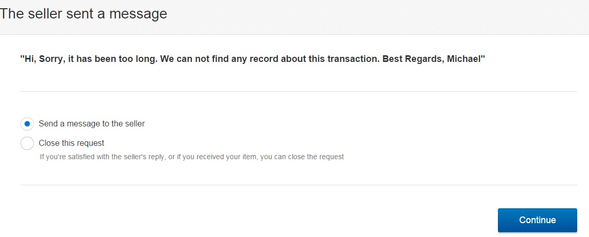 "Hi, Pls advice when did you buy this item from our store. We can not find any record about this transaction. Best Regards, Michael"אני: רשמתי לו תאריך קנייה ותשלום + חשבון שלי בפאיפל שבוצע דרכו(דרך איביי) + החשבון שלו שאליו העברתי את התשלום