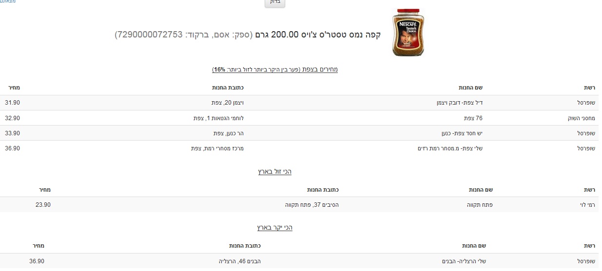 ) לקבצי נתונים שהרשתות חוייבו לספק מתוקף חוק המזון החדש.כך גיליתי, למשל, שקפה Taster's Choice נמכר ברמי לוי פ"ת תמורת 23.9ש"ח, ואין צורך להתעקש ולרכוש אותו דווקא בשופרסל שלי בהרצליה, תמורת 36.9ש"ח