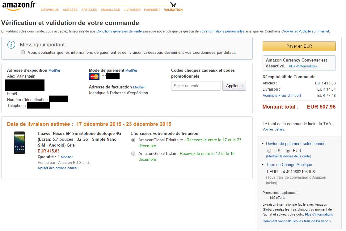 "מבצע באמזון צרפת על נקסוס 6P 32GB, ב-508 אירו (כ-2190 ש''ח)"