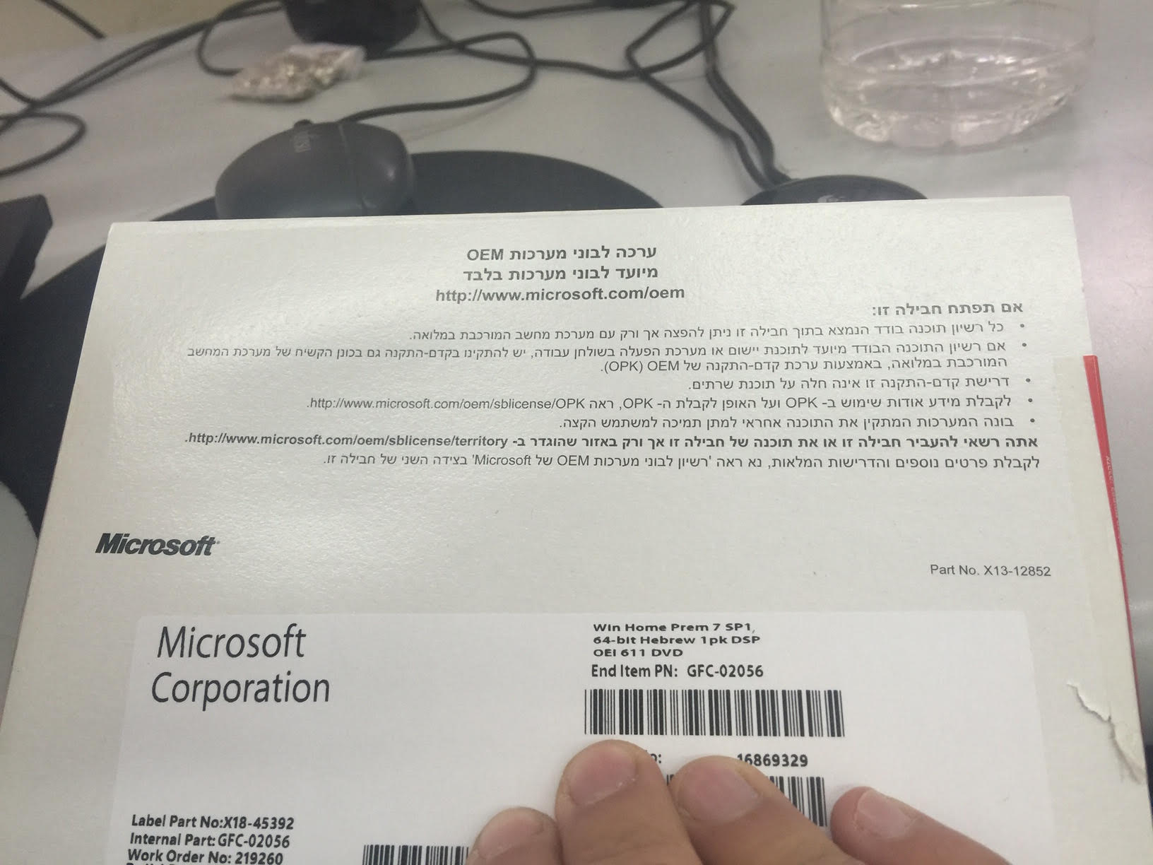 "למכירה |windows 7 home p 64bit בעברית בקופסה מקורית"