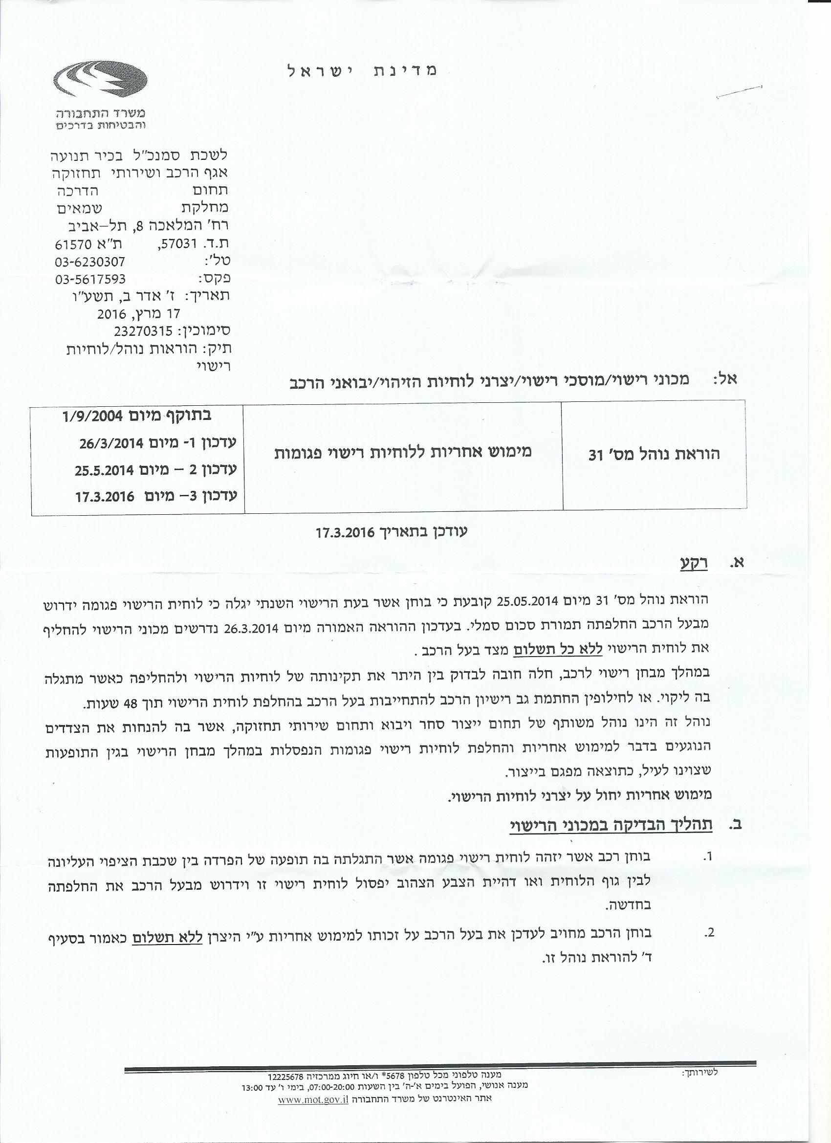1. הדפיסו את הוראת נוהל 31(על שני חלקיה) ושימרו אותה בצמוד לרישיון הרכב.