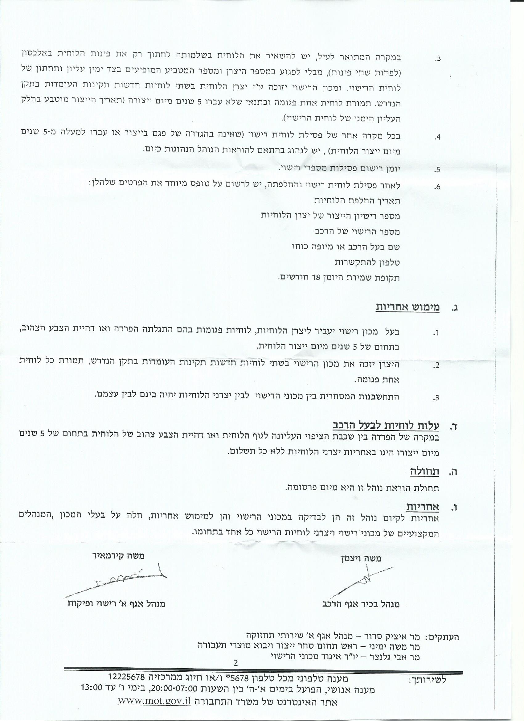 5. מכוני הרישוי ינסו "לנפנף" אתכם, אל תתנו להם זאת, הכח בידיכם. הם לא יפסלו בטענה שהלוחית "תקינה" עד שיחלוף זמן האחריות. הם ינסו להעביר את הנטל אליכם בכך שיטביעו חותמת התחייבות אישית של בעל הרכב בגב הרשיון ל-48 שעות.הם יטענו כי האחריות היא של היצרנים.
