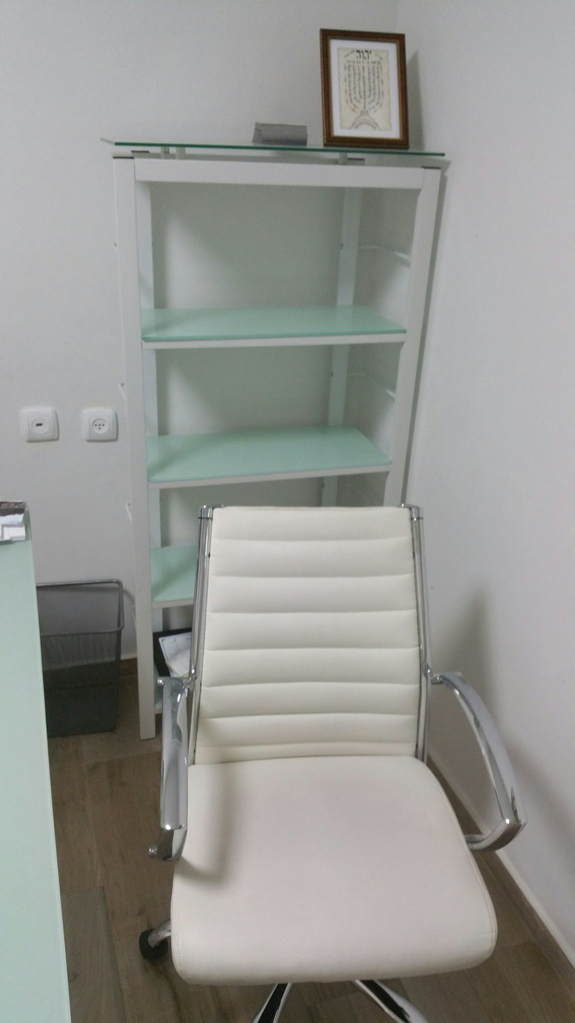 "למכירה שולחן זכוכית , כוננית תואמת וכסא מנהלים"
