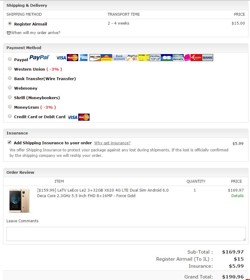 שימו לב, צריך להוסיף גם 15$ על משלוח, 1$ על "שרות נגד מכס" וגם 10$ עבור כוסוי+זכיכית מגן אם רוצים להוסיף אותם גם