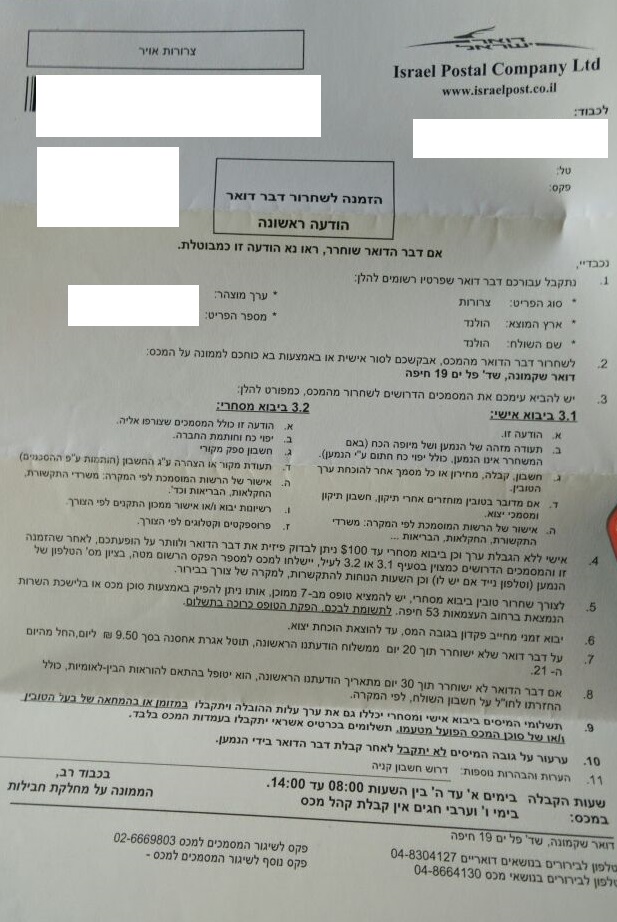 אז פשוט תדבר איתם בטלפון או תעביר אליהם בפקס את הקבלה מפייפל יחד עם מספר המעקב והמכתב המצורף כדי שהם ישחררו את זה לסניף הדואר באזורך.