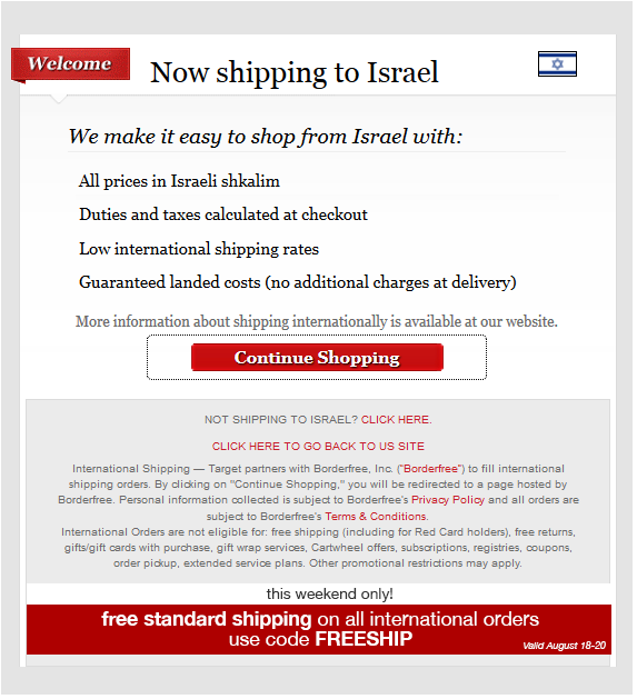 מבצע לסופ"ש: ענקית הקמעונות האמריקאית טרגט (target) מציעה מבצע מיוחד לישראלים - משלוח חינם לארץ במהלך סוף השבוע. המבצע יהיה בתוקף עד ליום ראשון הקרוב, 20 באוגוסט.טרגט היא הקמעונאית השנייה בגודלה בארה"ב, ויש לה כיום מעל 1,800 חנויות ברחבי ארה"ב, שבהן היא משווקת מגוון רחב של מוצרים במחירים נמוכים יחסית - החל מאופנה ונעליים, דרך עגלות ומוצרים לתינוקות, צעצועים, אלקטרוניקה, ואף ריהוט לבית ולגן.
