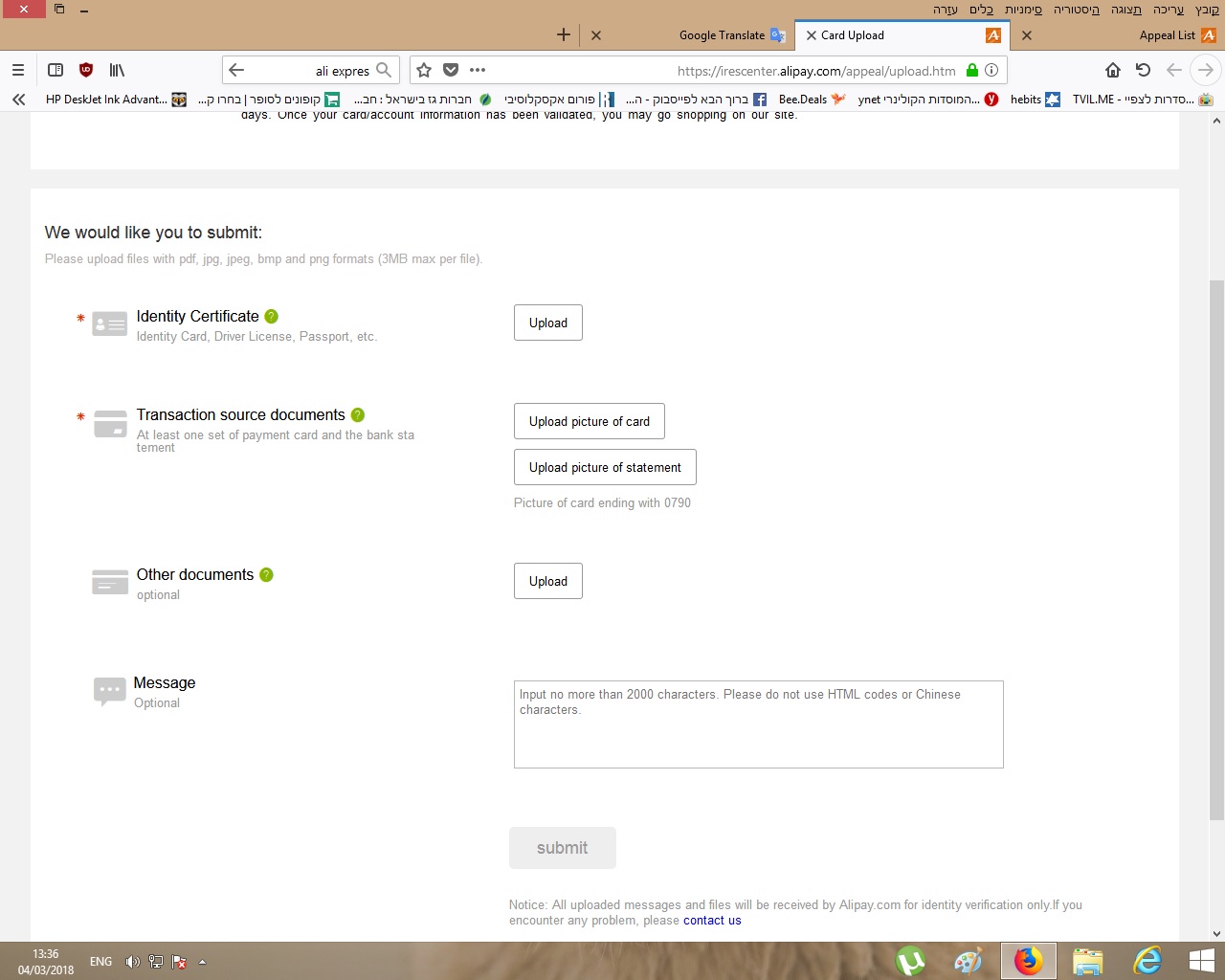 מחקתי את הכרטיס אשראי הקודם שהיה לי, ושמתי חדש. עלי לא מוכנים לקבל אותו אלה עם אני העלה מסמך של עסקעות בכרטיס או צילום של ת.ז שלי.