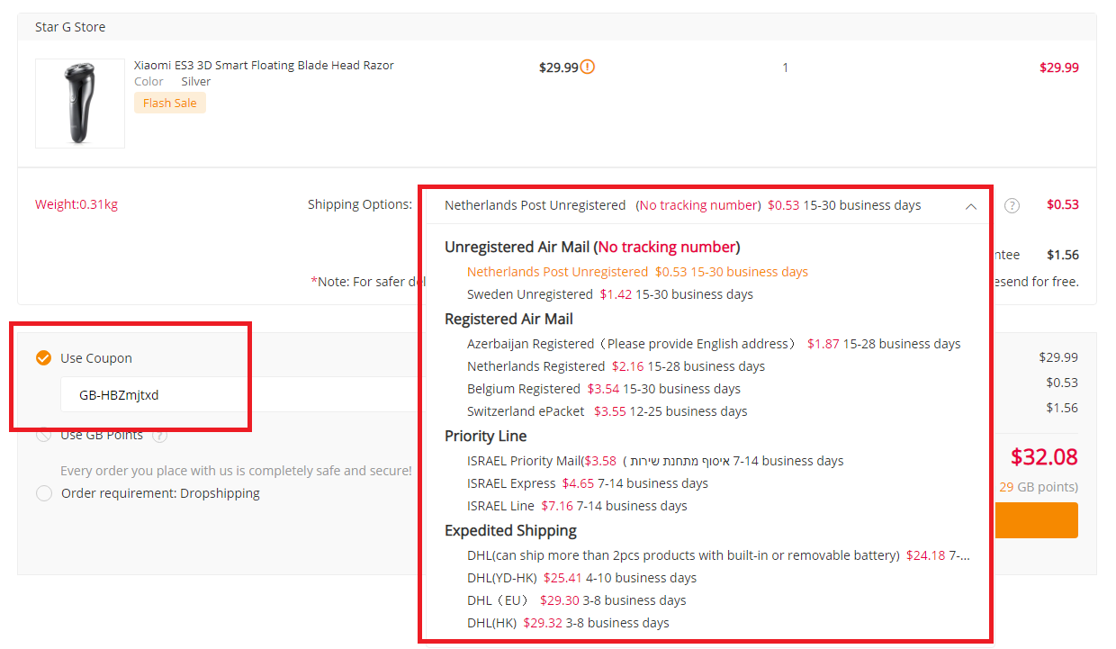 3. מגוון אפשרויות משלוח - עם/בלי מספר מעקב, עם/בלי חברת שליחויות וכו'. כמו כן המשלוח מהיר יחסית לאתרים סיניים אחרים. מבחינת מיסים - המיסים לא נגבים מראש ואם מזמינים מוצר מעל 75$ תיתכן עלות נוספת של מע"מ (17%) ודמי טיפול (בהתאם לחברת משלוח)