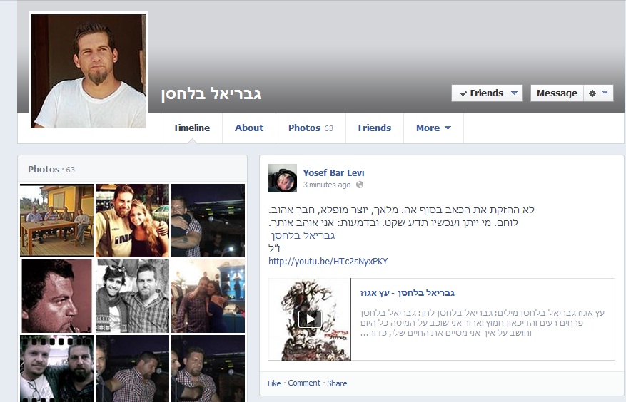 גבריאל בלחסן מסמל עבורי הרבה דברים. אחד מהם זה שהחיים הם לא בהכרח דבר טוב. הפעם הראשונה שנחשפתי למחלה מאניה דפרסיה בעצם זה דרכו. עוד דבר שגבריאל בלחסן חשף לי זה שלא כל סיפור הוא HAPPY ENDING. התחלתי להקשיב לאלג'יר לפני 6 שנים. לפני 3 שנים הייתי בפעם הראשונה בהופעה של אביב גדג' באוזן בר. הופיעו שם בהפתעה אהוד בנאי, שלומי שבן ועוד. כל כך קיוותי שגבריאל יצוץ שם. ישיר וינגן את "בתוך הצינורות" ואז ירד. הוא לא עלה. מאז כל פעם שהייתי בהופעה של אביב או כל משהו שאולי יתקשר לזה, חיפשתי את גבריאל. לצערי לא יצא לי לראות את גבריאל מופיע וגם לא יצא. כל כך חבל לי שהוא לא זכה לסוף טוב כמו שהוא באמת היה ראוי לו. מקווה שלפחות עכשיו הוא שקט. |