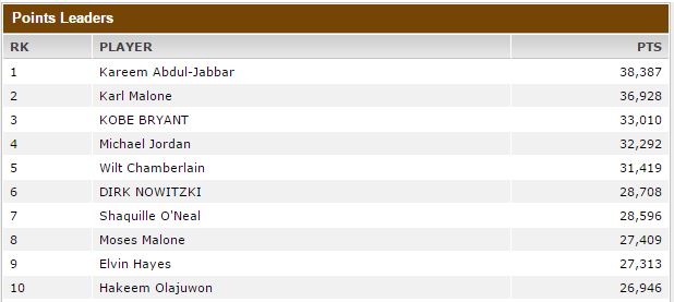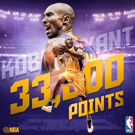 קובי בריאנט חצי את רף ה33,000 נק' והצטרף לגדולים קארים אבדול ג'אבר וקארל מלון.