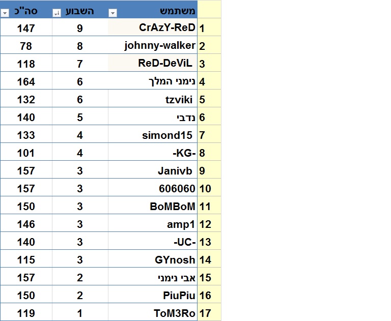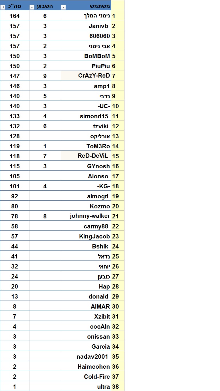 1. הניחוש תוצאה מדוייקת מציל אותי ממחזור גרוע...והעיקר שהפער בצמרת גדל. חג שמח