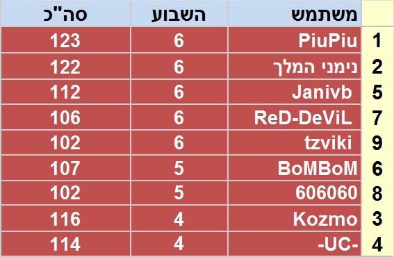 ברכות ל-PiuPiu, Janivb, נימני המלך, tzviki ו-ReD-DeViL עם 6 נקודות במקום הראשון השבועי!