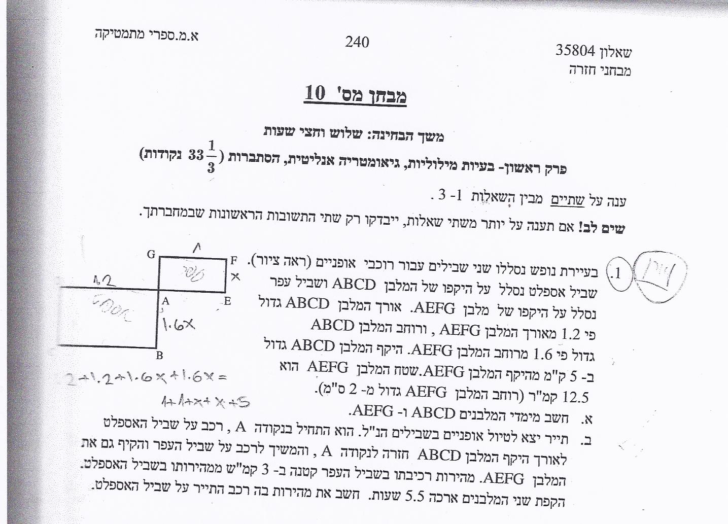 נפתור את המשוואה ונקבל ש-v=8 או v=1.363636, מכיוון שהמהירות בשביל העפר קטנה ב-3 מv, הערך של v חייב להיות 8.