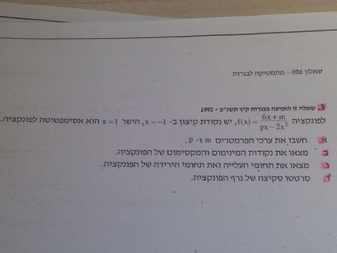 אם תשווה את המכנה ל0 ותציב בו X=1, תמצא ש P=2והתרגום של הרמז הראשון למתמטית הוא שאם תגזור את הפונקציה, תשווה ל0, תציב בX=-1 , תצא לך משוואת אמת וככה תוכל למצוא את M (אחרי שתציב את P תקבל משוואה אחת עם נעלם אחד M)