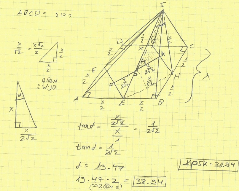 אבל העובדה ש-OS שווה לצלעות הבסיס, נותנת אפשרות לחשב בלי צורך במספרים אלא רק הצבה במשוואה.