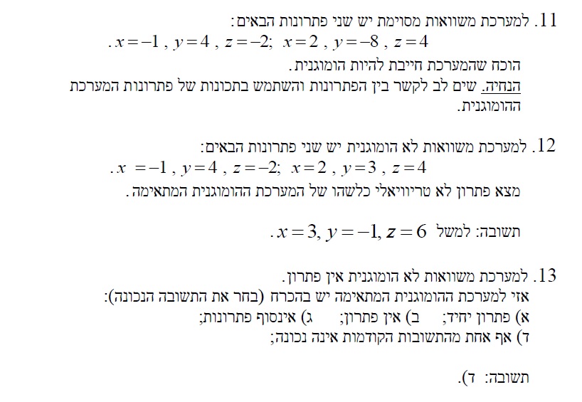13 מצב של אין פתרון להומוגנית זה בעצם מצב שכול המשתנים במטריצה מתאפסים ורק עמודת המקדמים נשארת עם מקדם. כשאנחנו רוצים למצוא את את הפתרונות של ההומוגנית אז מאפסים את עמודת המקדמים... פתרון טריוויאלי תמיד יש ואולי יהיה פתרון נוסף. אם לא הייתה תשובה לא היה לי הסבר.