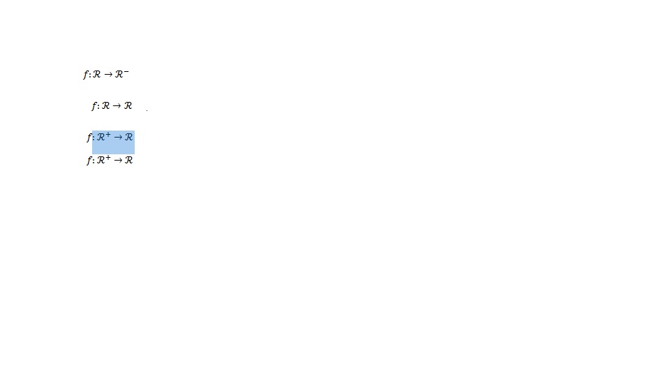 הראשון, זה מכל קבוצת המספרים הממשיים ומחזירה ערך מקבוצת המספרים הממשיים השליליים. השני, זה מכל קבוצת המספרים הממשיים ומחזירה ערך מקבוצת המספרים הממשיים השלישי, זה מכל קבוצת המספריים הממשיים החיוביים ומחזירה ערך מקבוצת המספרים הממשיים הרביעי, זה מקבוצת המספרים הממשיים החיוביים ומחזירה ערך מקבוצת המספרים הממשיים