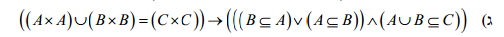 עכשיו אתה אומר נניח בשלילה שלא מתקיים B מוכל בA או A מוכל בB. כלומר בהכרח קיים x השייך לB כך שx לא שייך לA, כמו גם y השייך לA שלא שייך לB. כבר הוכחנו שAUB מוכל בC, אזי הזוג הסדור x,y בהכרח שייך לCXC. ונתון לנו שCXC זה איחוד AXA עם BXB, כלומר הזוג הסדור x,y שייך לAXA או לBXB, בסתירה להנחה שx לא שייך לA וy לא שייך לB, כלומר בהכרח B מוכל בA או A מוכל בB.