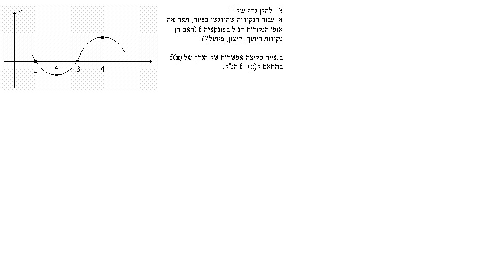 לא אומרים לך איפה יש חיתוך עם הצירים או משהו בסגנון אז הלכתי סתם רנדומלי אבל התייחסתי למתי הנגזרת מעל ציר X (עולה) ומתי מתחת (יורדת) וכמובן מתי שהיא חותכת את ציר ה-X אזי -> נקודת קיצון.