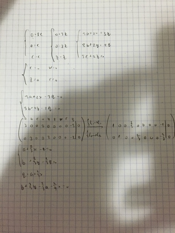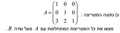 שאלה שנייה הרעיון, כמו שהתחלת, הוא לקחת מטריצה B כלשהי עם 9 נעלמים ולפתור AB = BA. אתה אמור לקבל 9 משוואות ב-9 נעלמים. בגלל האפסים ב-A חלקן משוואות מאד פשוטות שיגלו לך מהר את ערכי B.