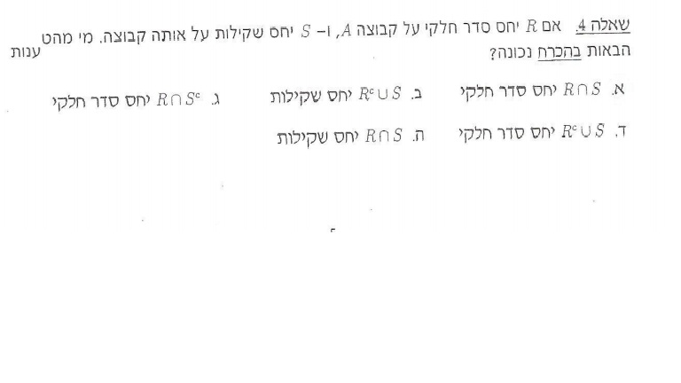 לא מצליח לישון :( רפלקיסיביות - מיידי אנטי סימטריות - לא יכולה להיפגע כי נעשה חיתוך טרנזטיביות - כבר נדרשת הוכחה יותר רצינית אז יהיו זוגות aRb ו- bRc וaRc כלשהם נניח בשלילה שיחס החיתוך אינו טרנזטיבי- כלומר 2 הזוגות הראשונים נמצאים בחיתוך אבל הזוג aRc לא נמצא. אז מתקיים aSb bSc ולא מתקיים aSc בסתירה לטרנזטיביות של S המקרה ההפוך דומה (שמתחילים מ-S ומסיימים ב-R)
