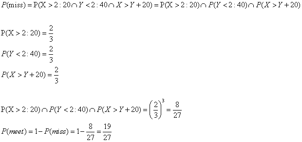 אם החבר ה-1 יגיע לפני 2:20 ויחכה כל הזמן אז משמע 100% הוא יפגוש את החבר השני כלומר אם יש סיכוי שהוא יפספס את החבר השני הוא צריך להגיע בין 2:20-3 כלומר בהסתברות של 2/3 שיגיע בטווח הזה
