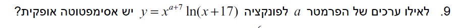 אתה צריך לחפש ערכי a כך שכשאר x->אינסוף הפונקציה תקבל ערך קבוע (תשאף לערך קבוע כלשהו) מהסתכלות על הפונקציה היא בנויה מכפל של פונקציה מעריכית ולוגריתמית. המצב היחיד שמכפלתם "לא תתפוצץ" באינסוף (x->אינסוף גורר y->אינסוף) הוא שהפונקציה המעריכית תדעך יותר מהר מהפונקציה הלוגריתמית, כלומר כאשר a < -7